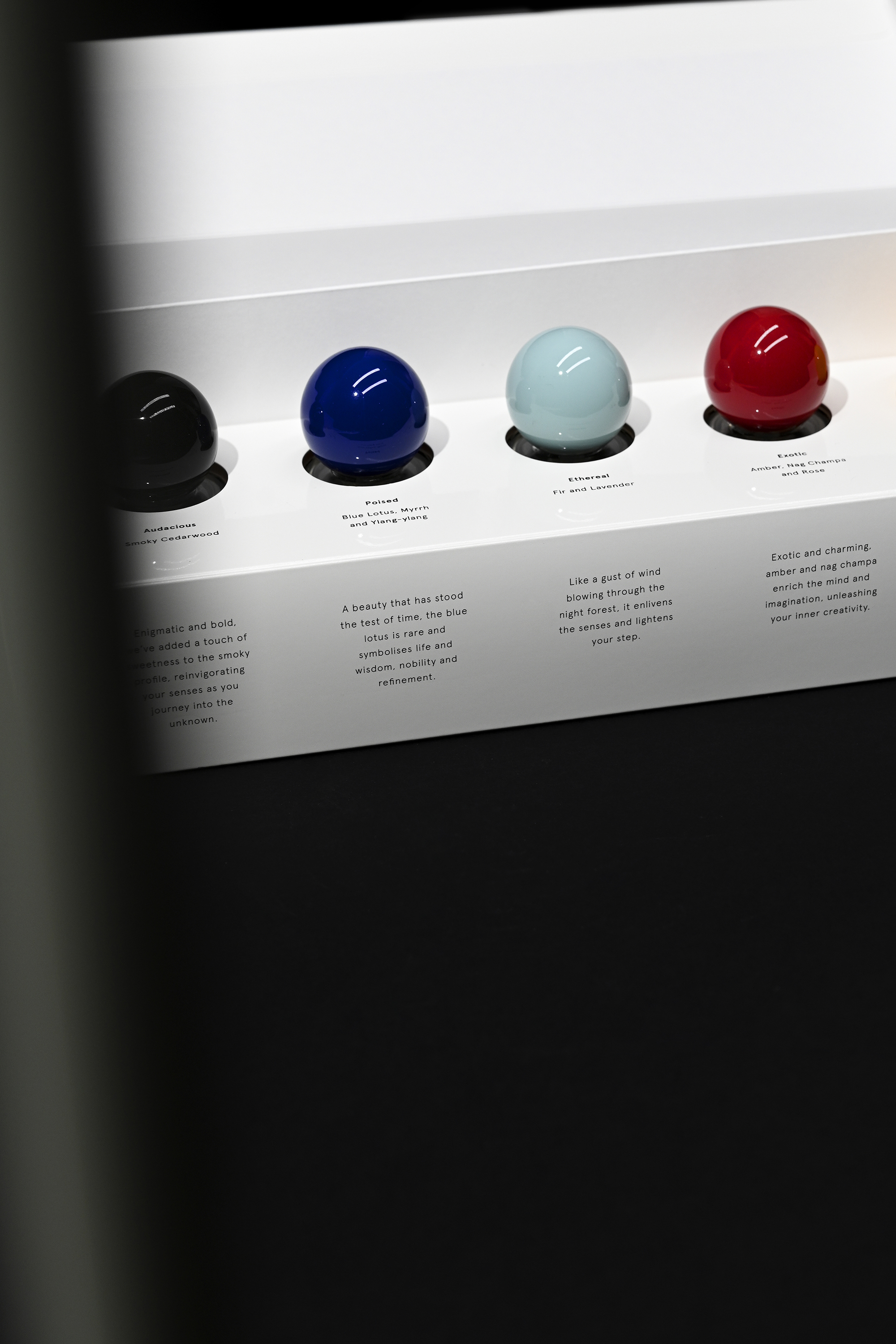 In line with the exhibition's theme, we have designed the packaging to represent the five scents within the perfume set and to showcase that everyone has their unique personality traits. The overlapping shapes highlight the communication between individuals within the community. The branding design is centered around a versatile font, reinforcing the product's concept. In terms of printing and production, we have primarily used black and white, with glossy cards and matte black embossing in the packaging. This not only aligns with the client's budget but also creates a strong contrast between the black-and-white exterior and the cap colors of each perfume, adding depth and dimension to the packaging.